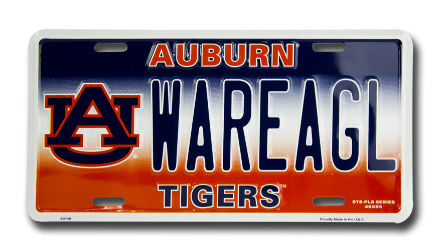 Auburn WAREAGL 6 x 12 Embossed aluminum license plate with baked on finish and four universal mounting slots. Officially licensed and made in the USA. Brand new in factory shrink wrap.