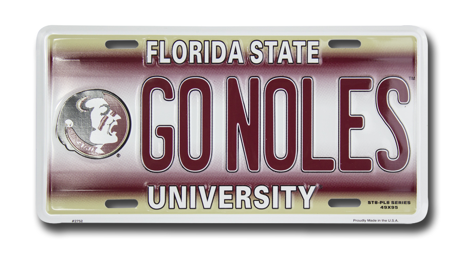 Hangtime FSU GO NOLES 6 x 12 Embossed aluminum license plate with baked on finish and four universal mounting slots. Officially licensed Florida State merchandise and made in the USA. Brand new in factory shrink wrap.
