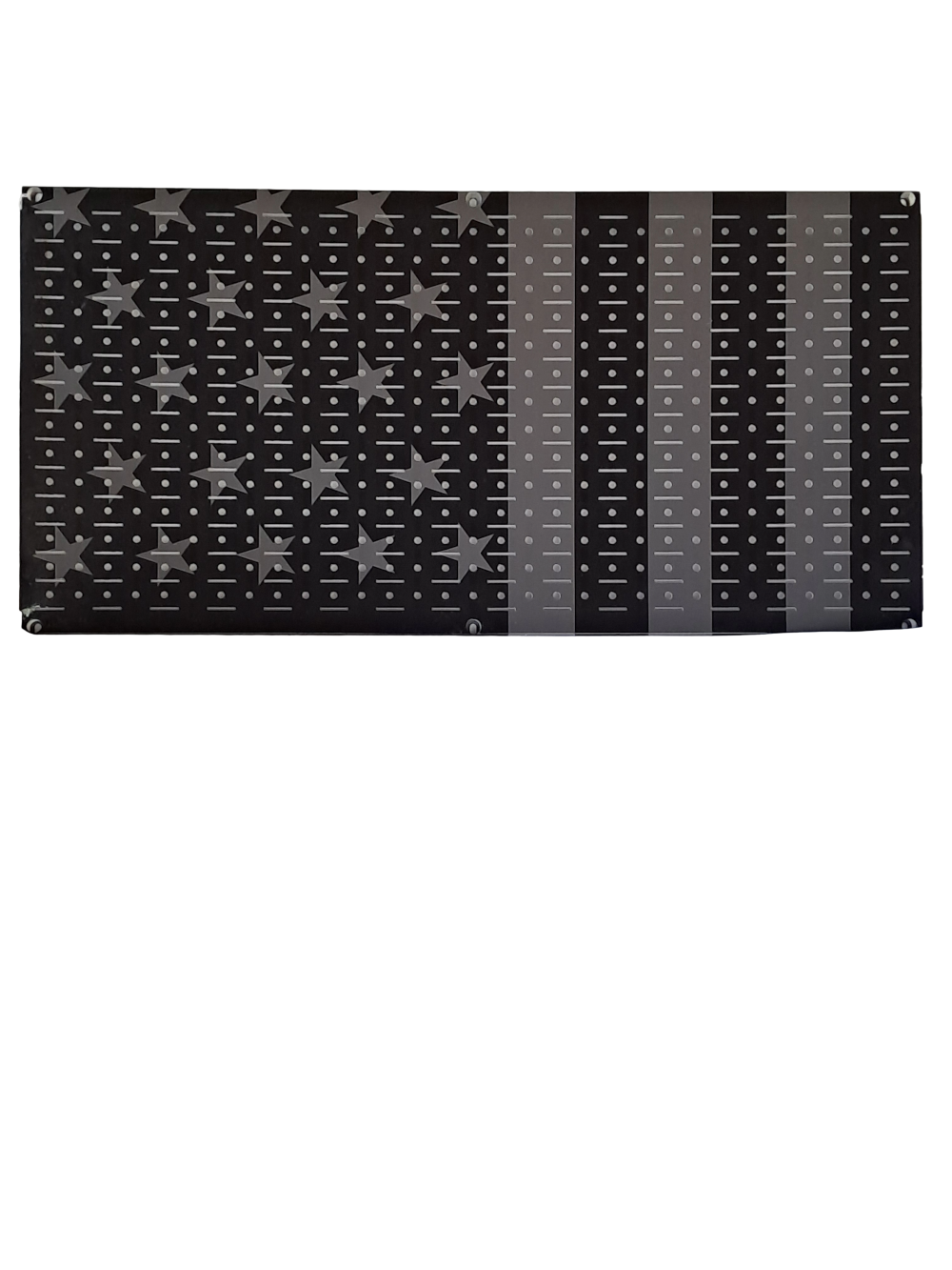 Product Description Hangtime Black and Gray Grid Style 32 x 16 inch Flag Wall Hanging 6 holes for easy mounting. Made of aluminum with baked on finish. Brand new in factory packaging. Proudly Made in the USA ONE OF A KIND!