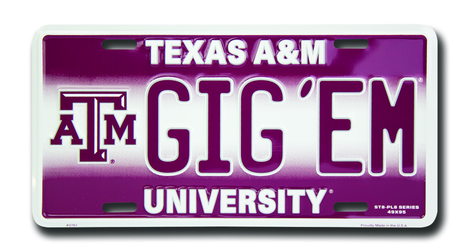 Texas A&M GIG'EM 6 x 12 Embossed aluminum license plate with baked on finish and four universal mounting slots. Officially licensed and made in the USA. Brand new in factory shrink wrap.